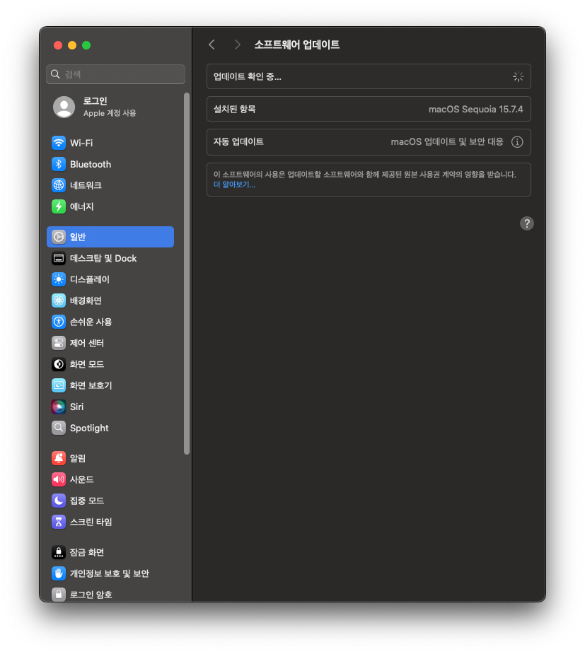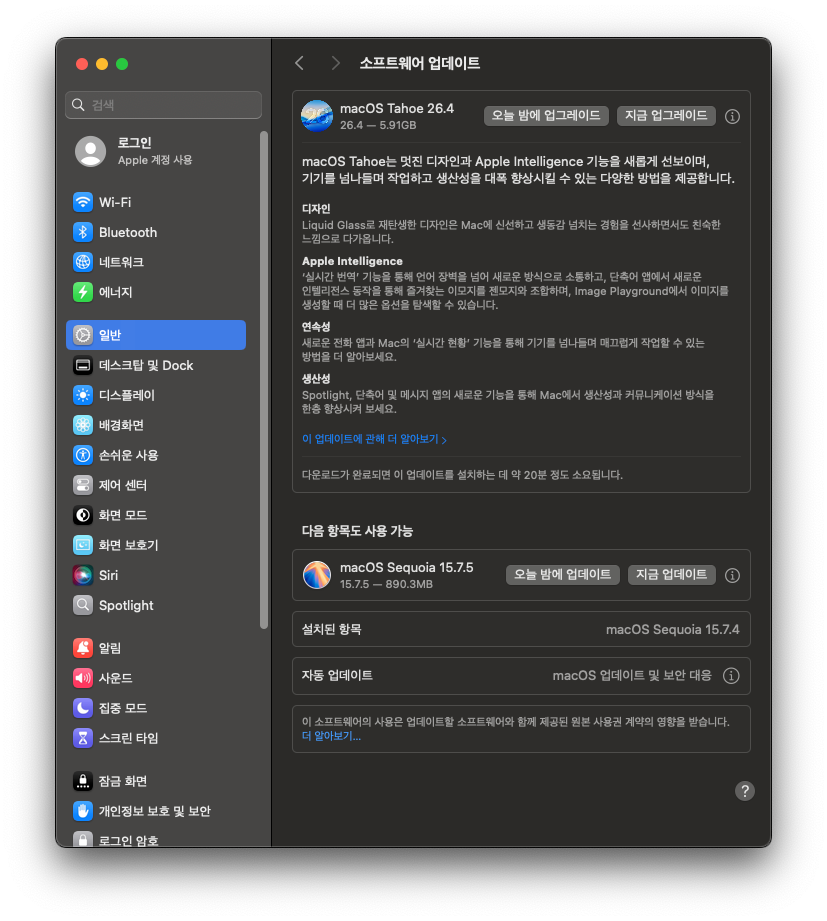 현재 사용중인 macOS Sequoia 15.7.4 에서 15.7.5로 OTA 업데이트가 가능하다는걸 알수 있습니다.