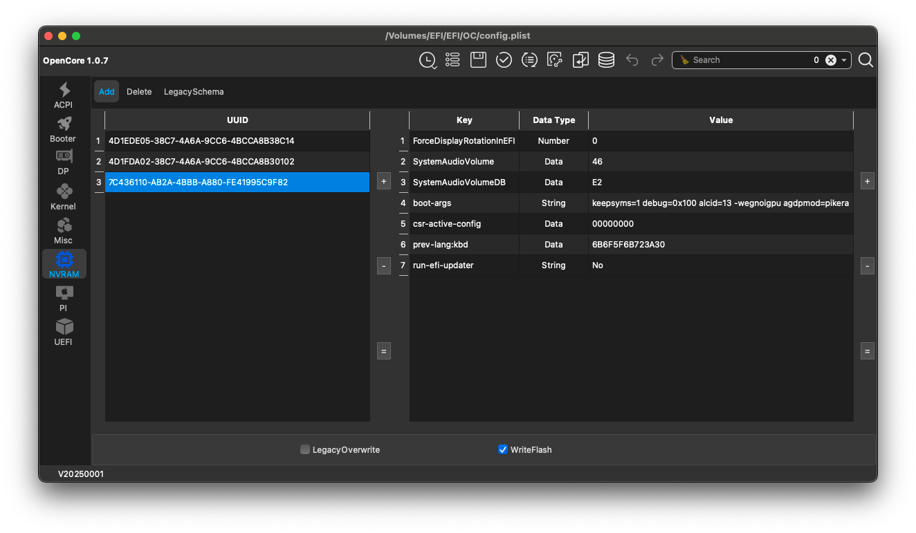 OpenCore Auxiliary Tools(OCAT)로 현재 사용 중인 config.plist를 엽니다.- NVRAM -> Add -> 7C436110-AB2A... 항목으로 이동합니다.