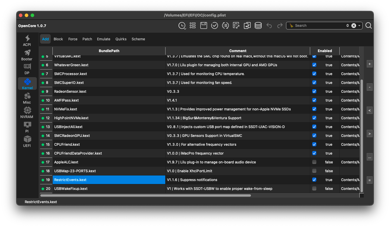 Kernel -> Add항목에RestrictEvents.kext가 등록되어 있고 Enabled 체크가 되어 있는지 확인하십시오. - 추가 팁: 만약 MacPro7,1이나 iMacPro1,1 등의 모델명을 사용 중이라면, 이 kext를 통해 메모리 설정 오류 메시지를 숨기거나 CPU 이름을 올바르게 표시할 수도 있습니다.