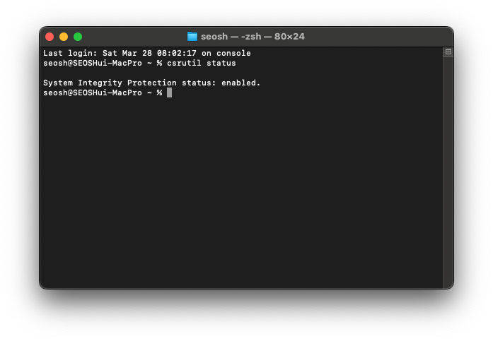 - 업데이트를 위해서는 반드시 'System Integrity Protection status: enabled.' 메시지가 표시되어야 합니다.